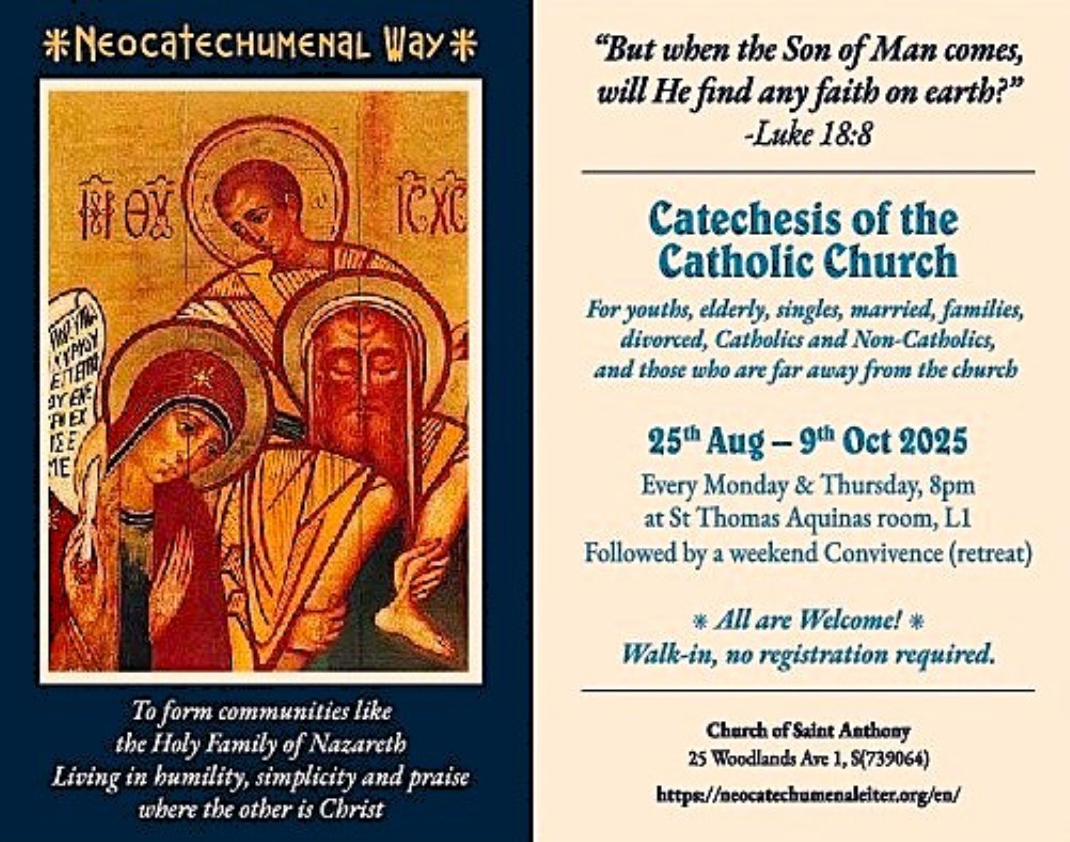 Initial Catechesis for families, adults, youth & heavily burdened, begins on the 25th Aug ~ 9th Oct 2025 Every Monday & Thursday @ 8pm. Church of the St Anthony 25 Woodlands Ave 1, Singapore (739064). Venue : St Thomas Aquinas Room, L1. All are Welcome ! |