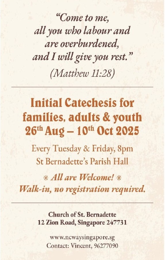 Initial Catechesis for families, adults, youth & heavily burdened, begins on the 26th Aug ~ 10th Oct 2025 Every Tuesday & Friday @ 8pm. Church of the St. Bernadette 12 Zion Road, Singapore (247731). Venue : St Bernadette's Parish Hall. All are Welcome ! |